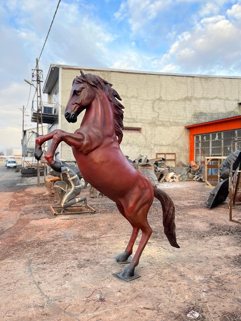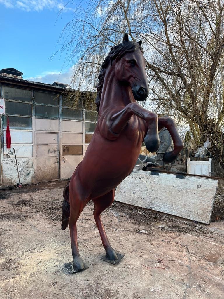 Şahlanan At heykeli 2.75x2.15x65 santimetre ebatlarında, polyester dökümü ile heykel atölyemizde üretilmiştir.